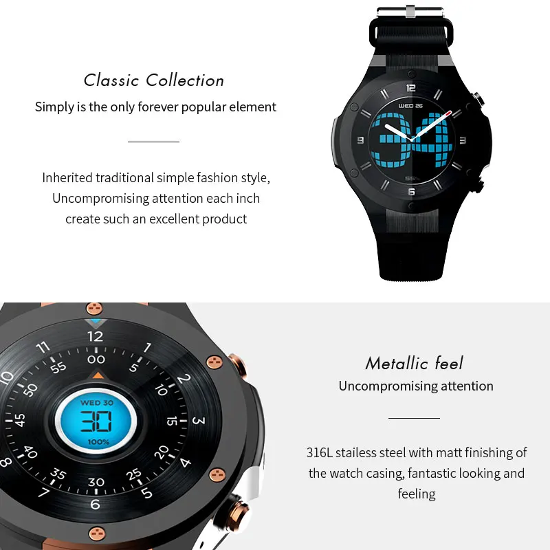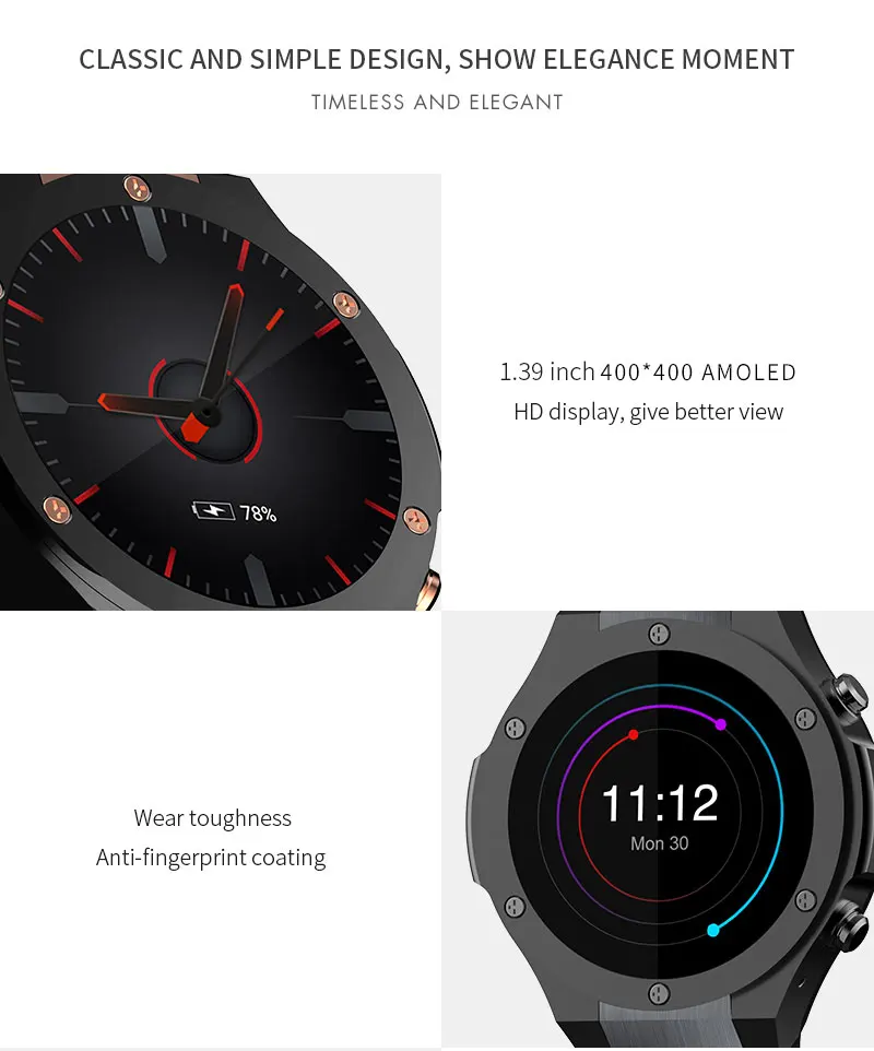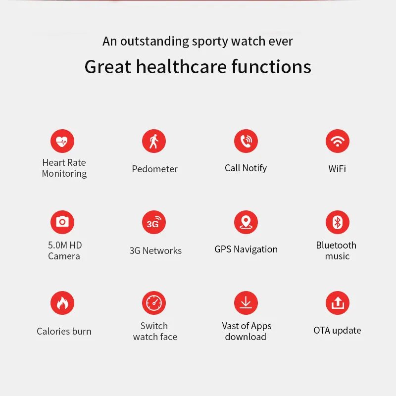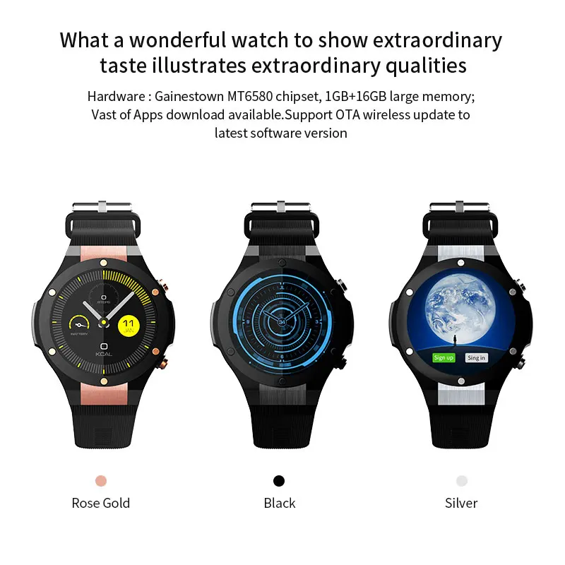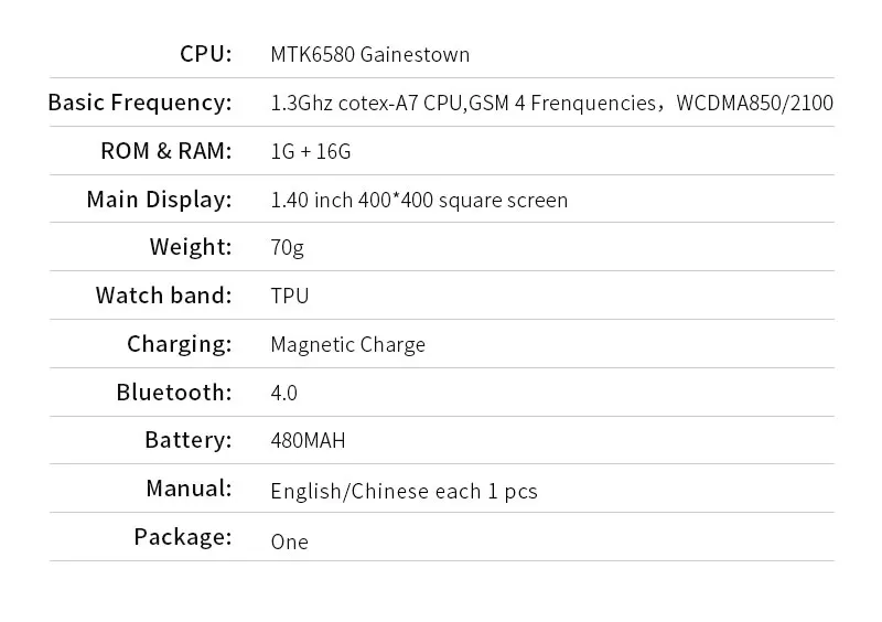 * Chipset: MTK6580 Gainestown, ROM & RAM:16GB+1GB* 1.40 inch 400*400 square screen, 5.0M HD Camera* Battery 480mAh High Power Polymer battery, long standby* Basic Frequency:1.3Ghz cotex-A7 CPU, GSM 4 Frenquencies, WCDMA850/2100* Support NANO SIM card, GPS navigation, 3G networks, WIFI* Bluetooth push: WhatsApp, Facebook,Email notifications* Heart rate monitor: PixArt 8001 heart rate monior sensor. Light sensation collect heart rate data 24 hours * OTA Wireless upgrade: Support OTA wireless update to latest software version* Vast of many watch faces, change depends on your mood, more watch faces update in the cloud* Bluetooth 4.0, Compatible with both IOS and Android* More functions: Heart rate monitoring, Call notify, Wifi, 5.0M HD Camera, 3G networks, GPS navigation, Bluetooth music, Caloriea burn, Switch watch face, OTA update, Vast of apps download, Anti-lost, Bluetooth push, Clock Display, Pedometer, Sedentary ,Sleep monitor, Phone Book, Alarm clock* Language: Simplified Chinese, Traditional Chinese, English, German, Spanish, Italian, French, Portuguese-Portuga, Portuguese-Brazilian, Russian, Indonesian, Malay, Polish, Vietnamese, Hebrew, Arabic, Persian, Thai, Burmese, Turkish, Japanese, Korean.Pictures: