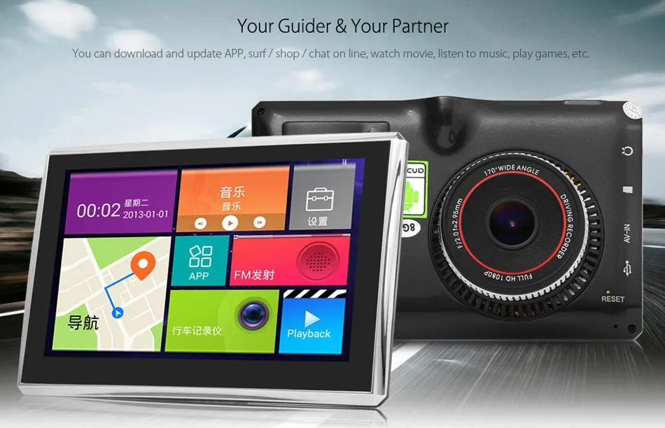 Car GPS navigation: supports Google maps and other Google softwares WiFi / 3G network: you can download and update APP, surf / shop / chat online, watch a movie, listen to music, play games, etc. FM transmitter ( 76 - 108MHz ): transmitting GPS voice navigation to the car speaker, enables you to hear stereo and clear voice prompt Car DVR function: with 170 degree wide angle 1080P full HD video recorder, protects you all the way Loop cycle recording: 3 / 5 minutes for option OS: Android 4.4.2 CPU: ARM, MTK8127 Cortex A7 quad-core 1.3GHz GPU: 2D / 3D, supports OpenGL ES 2.0 Solid-state disk: MLC Nand Flash 8GB, built-in MLC controllers, supports up to 64 bit of ECC SLC / MLC / TLC 15MB/s Built-in European maps, but you can download all countries from GoogleEuropean countries include: