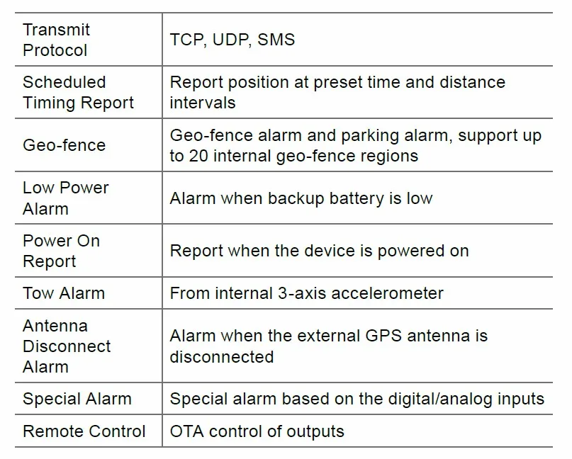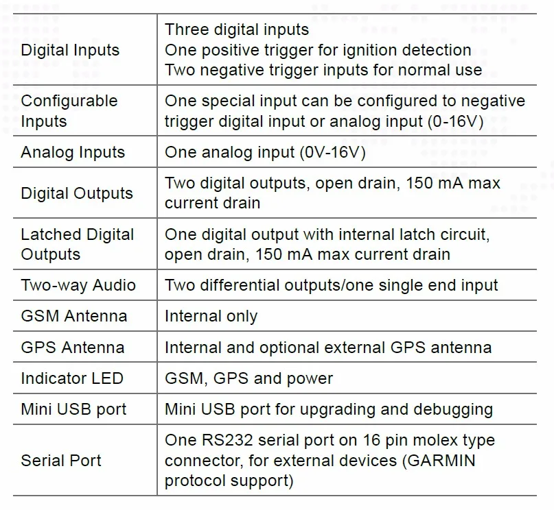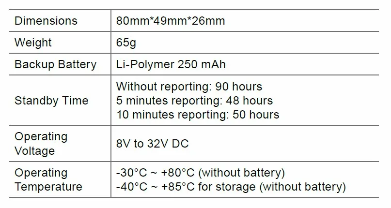 The GV300 is a compact GPS tracker designed for a wide variety of vehicle tracking applications. It has multiple I/O interfaces that can be used for monitoring or controlling external devices. Its built-in GPS receiver has superior sensitivity and fast time to first fix. Its quad band GPRS/GSM subsystem supports 850/900/1800/1900 MHz allowing the GV300Ns location to be monitored in real time or periodically tracked by a backed server and mobile devices. Its built-in 3-axis accelerometer allows motion detection and extends battery life through sophisticated power management algorithms. System integration is straightforward as complete documentation is provided for the full featured @ Track protocol. The @Track protocol supports a wide variety of reports including emergency, geo-fence boundary crossings, driving behavior, low battery and scheduled GPS position. gps tracker carFeatures: * Wide operating voltage range 8V to 32V DC* Internal u-blox chipset* Low power consumption, long standby time with internal battery* Quad band GSM/GPRS 850/900/1800/1900 MHz* Embedded full featured @Track protocol* Multiple I/O interfaces for monitoring and control* Internal 3-axis accelerometer for power conservation and motion detection* Internal GSM antenna* Inernal and external GPS antenna* CE/FCC/E-Mark certifiedGeneral Specifications: gps vehicle tracking