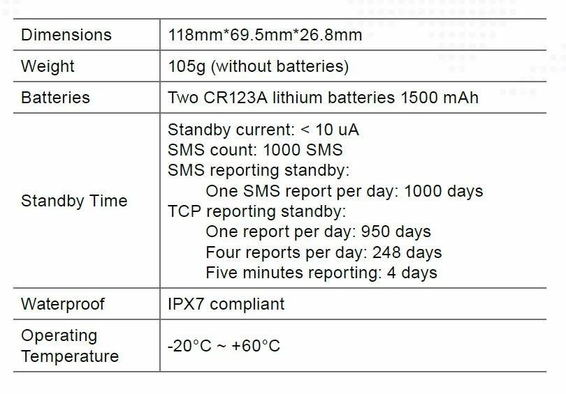 The GL505 is a powerful waterproof GPS tracker designed for fixed asset tracking applications. It is powered by two user replaceable CR123A lithium batteries.Configuration allows it to wake up on a preset schedule to check if it needs to shift from dormant to active status and/or send update of its current location, then returning to a dormant state. Optimally configured, it will operate autonomously for 1000 days.It built-in 3-axis accelerometer allows the GL505 to detect asset movement and transmit an alert message. The integrated @Track interface protocol allows the GL505 to communicate with a customer mobile phone or a backend server via GPRS/SMS and transfer reports of GPS position, etc. System integrators can easily incorporate the GL505 into existing tracking systems based on this full featured protocol.Features: * Waterproof, IPX7 compliant * Two CR123A lithium batteries 1500mAh * Low power consumption, long standby time for more than 1000 days * Internal u-blox chipset * Quad band GSM/GPRS 850/900/1800/1900 MHz * Embedded Track protocol * Internal 3-axis accelerometer for motion detection * Internal GSM antenna * Internal GPS antenna * FCC certifiedGeneral Specifications: