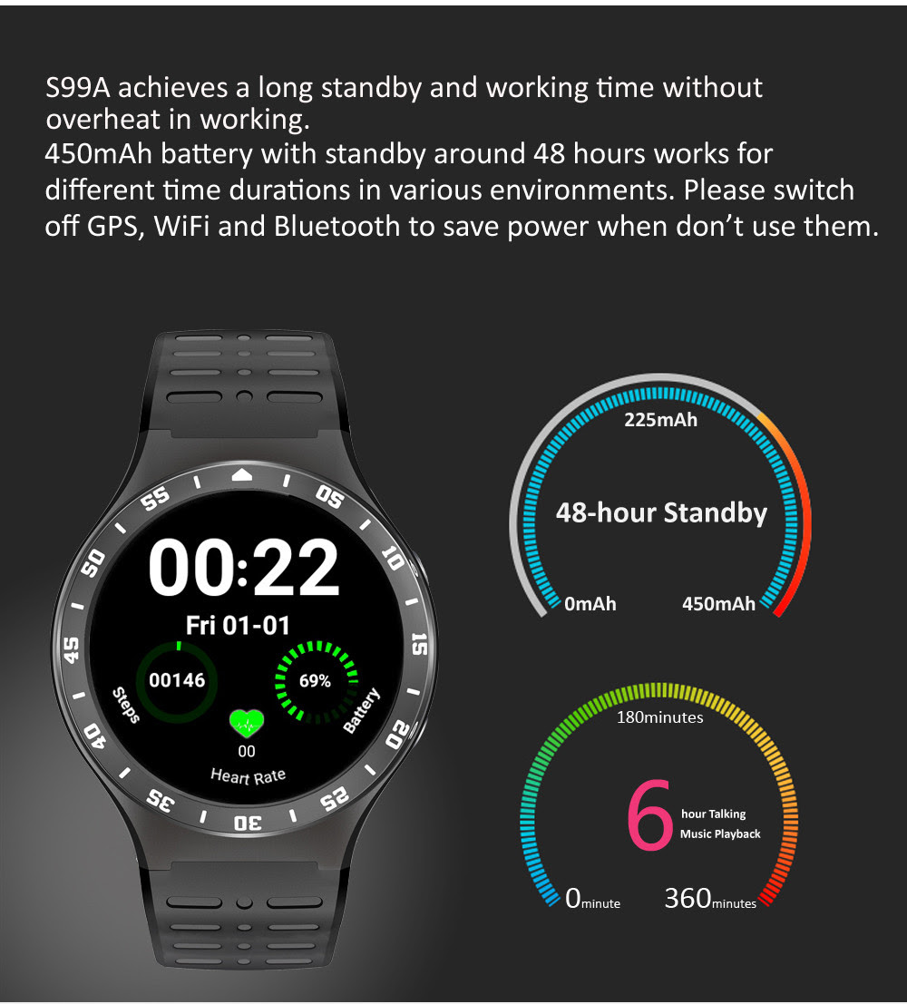 On-time Delivery: If you do not receive your purchase within 60 days, you can ask for a full refund before order completion (when you click "Confirm Order Received" or exceed confirmation timeframe).Fast Offers Slimy S99A Smart Watch 3G Smartwatch Phone 1.33 Inch Android 5.1 MTK6580 Quad Core 8GB ROM 2.0MP Camera WiFi Bluetooth GPS