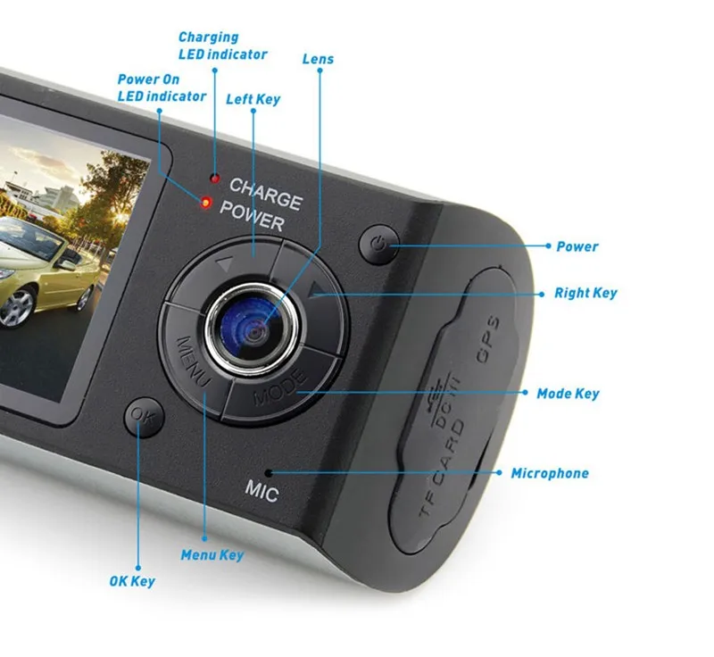 Description:1) 2.7 inch TFT LCD screen2) Dual lens, Surveillance on the outside and inside together3) the Front lens: ultra wide Angle of 140 degrees4) the Back lens: ultra wide - Angle of 120 degrees high resolution5) Built - in a quarter inch low noise and high - quality photographic element can capture ultra clear picture in a dark place6) Automotive turning on and recording function when the vehicle start.7) With a of start function to prevent transient pulse current damage to the machine at the moment the vehicle start.8) Built in microphone/speaker.9) Support high - capacity Micro TF Card, Up to 32 gb10) Built - in lithium with charging and meanwhile recording function.11) GPS scanning and positioning12) Gravity SENSORFeatures:Screen size: 2.7 inchViewing Angle: 140 degree in front (back) in 120GPS: scanning and positionMicrophone/Speaker: Built - inTelevision Output: NTSC/PALTV Output and DC Access: 5 v, 500 maBuilt - in lithium polymerSystem requirements: Windows 2000 / XP/Vista/Windows 7 and MAC OS x above 10.3.6 Language: English, Russian, Japanese, Korean, Thai, ChinesePackage include: 1 x Car DVRs Double Camera