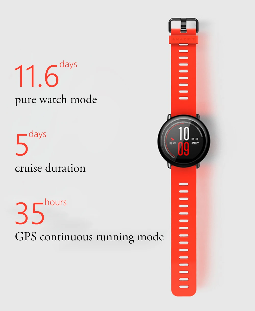 11.6 days pure watch mode 5 days cruise duration 35 hours GPS continuous running mode