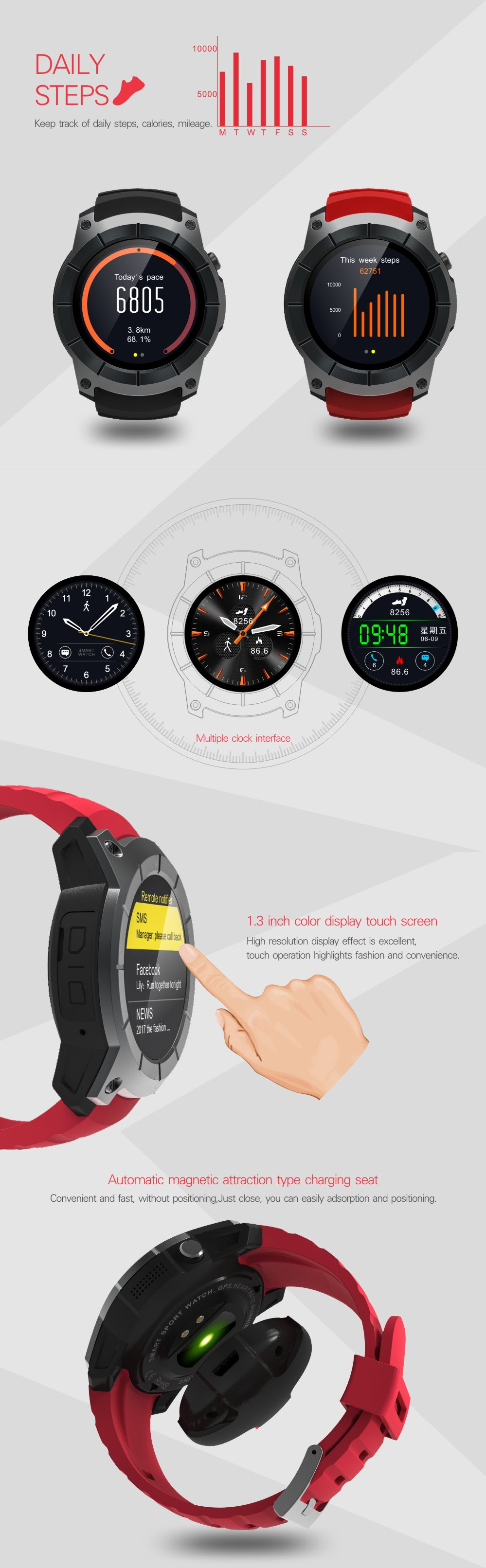 Model: GPS Sport Smart Watch (GPS, Air pressure, multiple modes of movement, call, heart rate) .