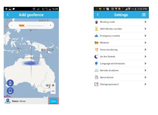 1. Real-time tracking2. Historical route3. Geo-fence4. SOS call5. Voice monitoring6. Do not disturb mode7. Two way talk8.Various work modes: rapid positioning, standard positioning and save electricity positioning.9. Multi-platform monitoring: support android, apple mobile phone system, computer network clients, etc10.Universal: four frequency support GSM network, languages and time zone settingEquipment parameters: