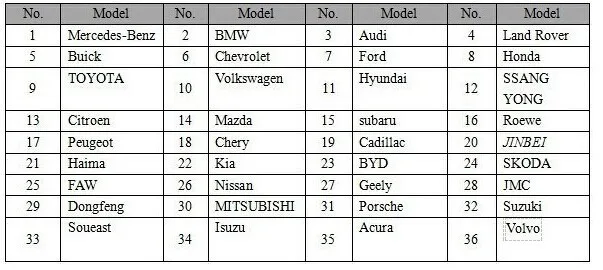 SAE J1850 PWM SAE J1850 VPW ISO 9141-2 ISO 14230-4 (KWP2000_5BPS) ISO 14230-4 (KWP2000_FAST) ISO 15765-4 (CAN500_11BIT) ISO 15765-4 (CAN500_29BIT) ISO 15765-4 (CAN250_11BIT) ISO 15765-4 (CAN250_29BIT) Support vehicle models: